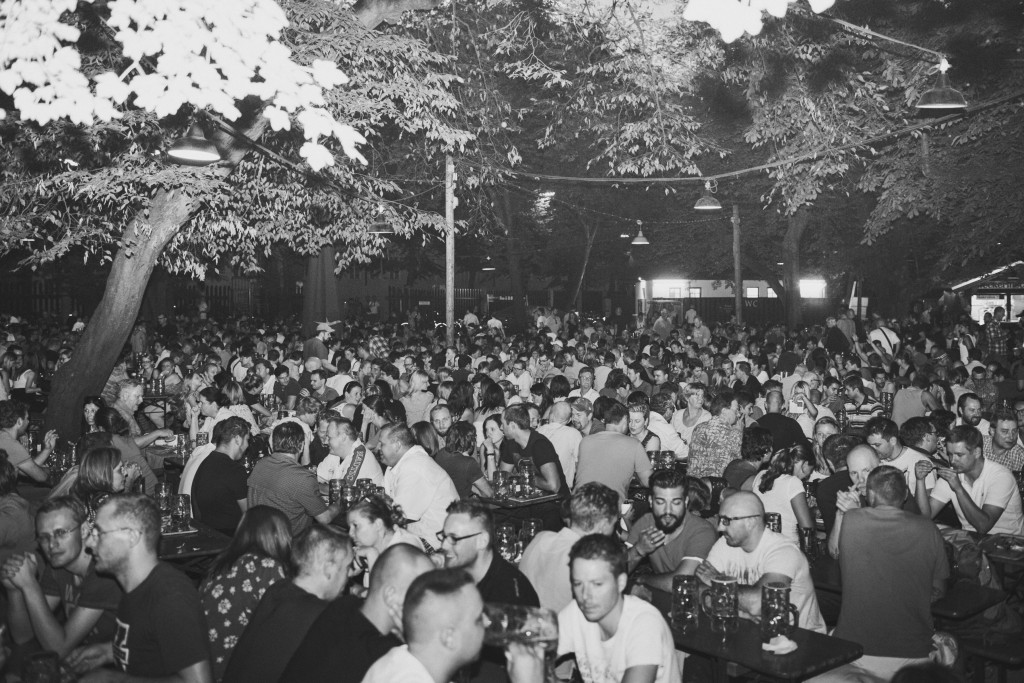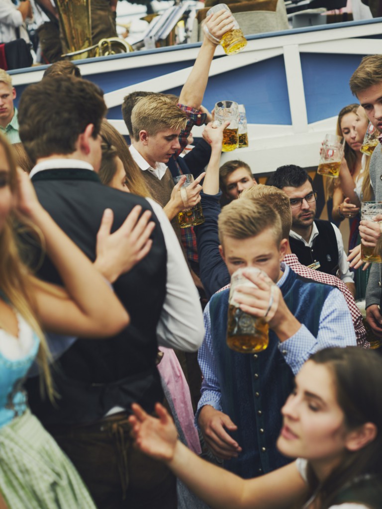 Junge Biertrinker warten auf den Einlass ins Bierzelt